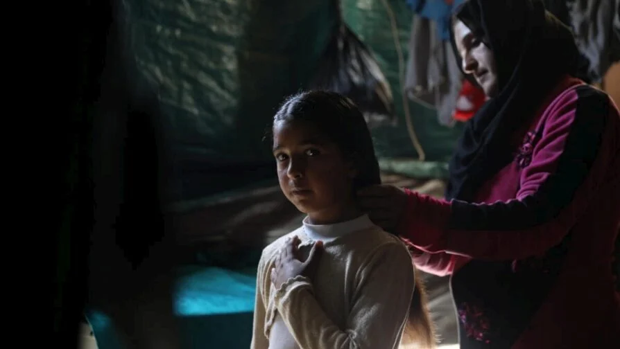 Asmaa escova o cabelo de Arkan. A menina de 10 anos se tornou o principal sustento da família desde que seu pai sofreu lesões que o impedem de trabalhar. © ACNUR/Houssam Hariri