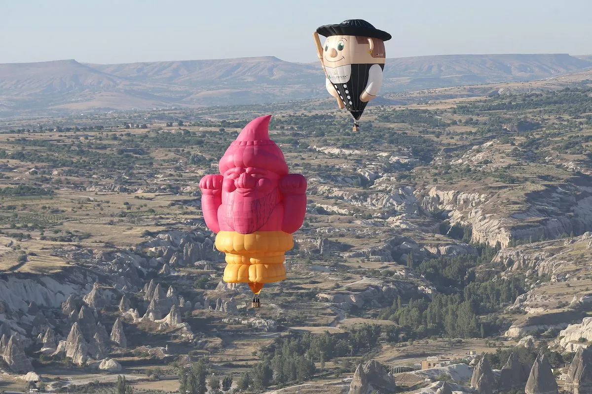 Balões de ar quente com diversas imagens flutuam no céu da Capadócia durante o 3° Festival Internacional de Balões da Capadócia, em Nevsehir, Turquia, 22 de julho de 2022 [Behçet Alkan/Agência Anadolu]