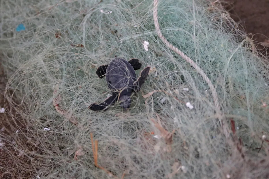 ma tartaruga verde bebê emaranhada na rede é tentando chegar ao mar em uma praia na Área de Melhoramento da Vida Selvagem de Akyatan, no distrito de Karatas, em Adana, Turkiye, em 08 de agosto de 2022 [Eren Bozkurt – Agência Anadolu]