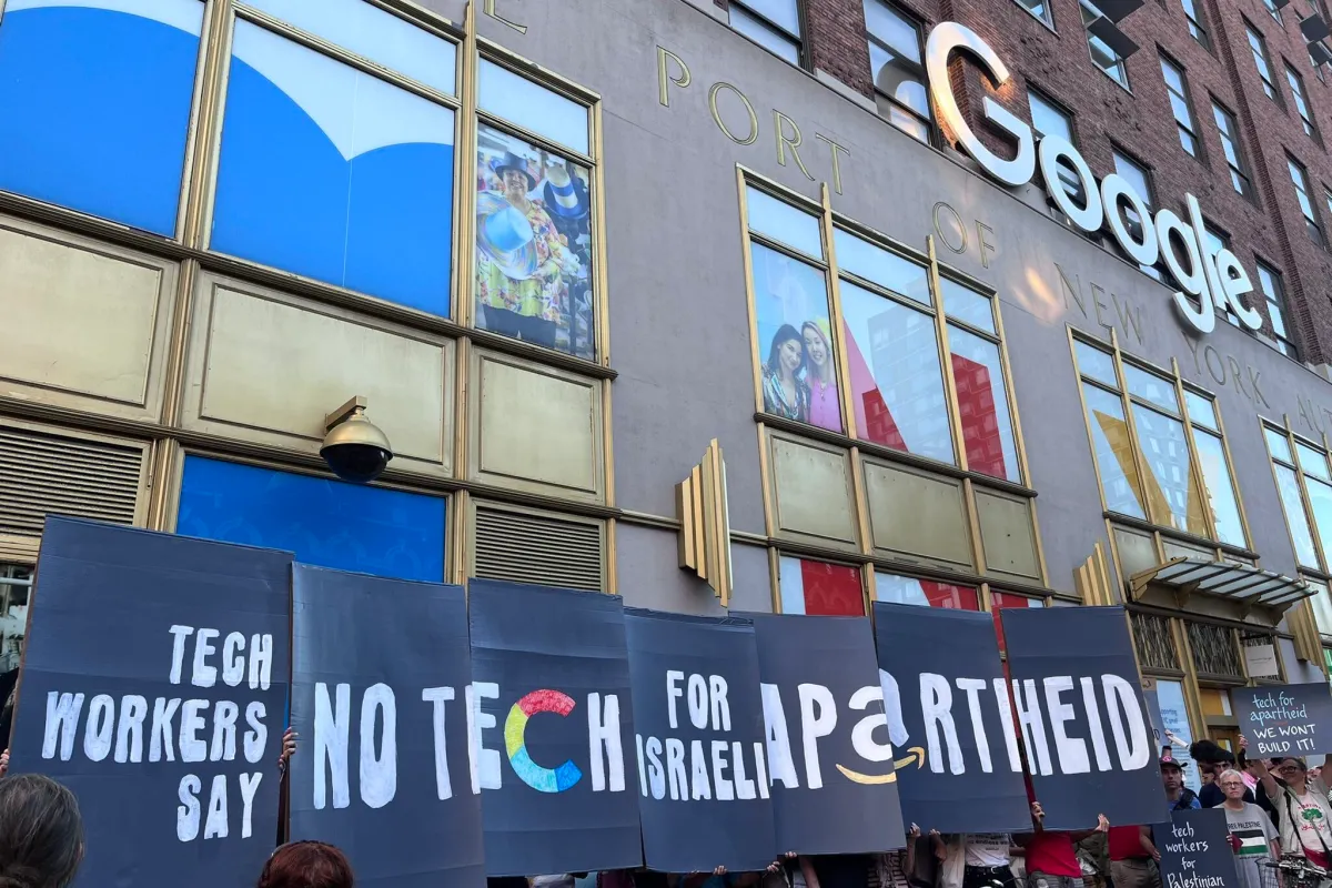 Trabalhadores das gigantes de tecnologia Google e Amazon tomaram as ruas na tarde de quinta-feira (8) para protestar contra o projeto Nimbus, empreendimento de US$1.2 bilhão financiado por Israel.