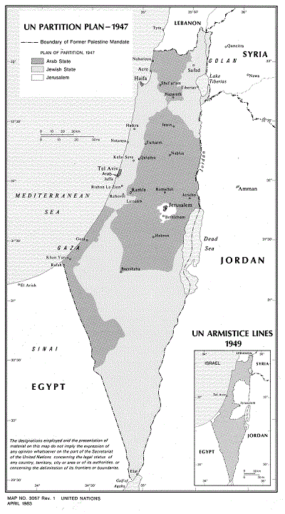 26 de setembro de 1947 – Sabendo da impossibilidade de executar qualquer um dos planos, o governo de Sua Majestade anuncia uma retirada antecipada, prevista para 1º de agosto de 1948, deixando a cargo da recém-fundada Organização das Nações Unidas, o destino de 1,2 milhões de palestinos e 600 mil euro-judeus em plena guerra civil.