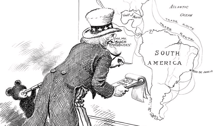 Tio Sam mapeando as rotas de comércio dos EUA para a América do Sul. Charge de Clifford Berryman, 1913.