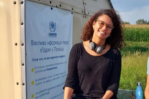 Adriana em Medyka, um dos centros de informação presentes na travessia entre a Ucrânia e a Polônia. [©ACNUR/Arquivo Pessoal]