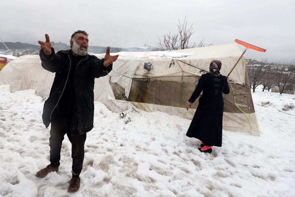 Um idoso sírio reage enquanto uma mulher limpa a neve que cobre uma barraca em um acampamento, em 23 de janeiro de 2022 [Abdulaziz Ketaz/AFP via Getty Images]