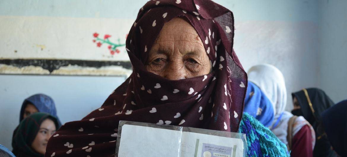 As restrições do Talibã a mulheres e meninas no Afeganistão excluirão as mulheres da participação em atividades políticas como votação, como aconteceu com esta mulher no centro de votação de Bamyan para as eleições parlamentares do Afeganistão, realizadas em 20 de outubro de 2018. [Abbas Naderi/Unama]