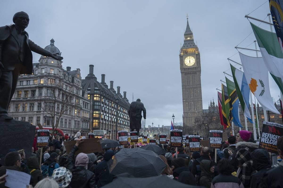 Centenas de pessoas se reuniram em frente ao parlamento em Londres para protestar contra o novo projeto de lei de asilo do governo e mostrar solidariedade às pessoas que buscam refúgio no país.