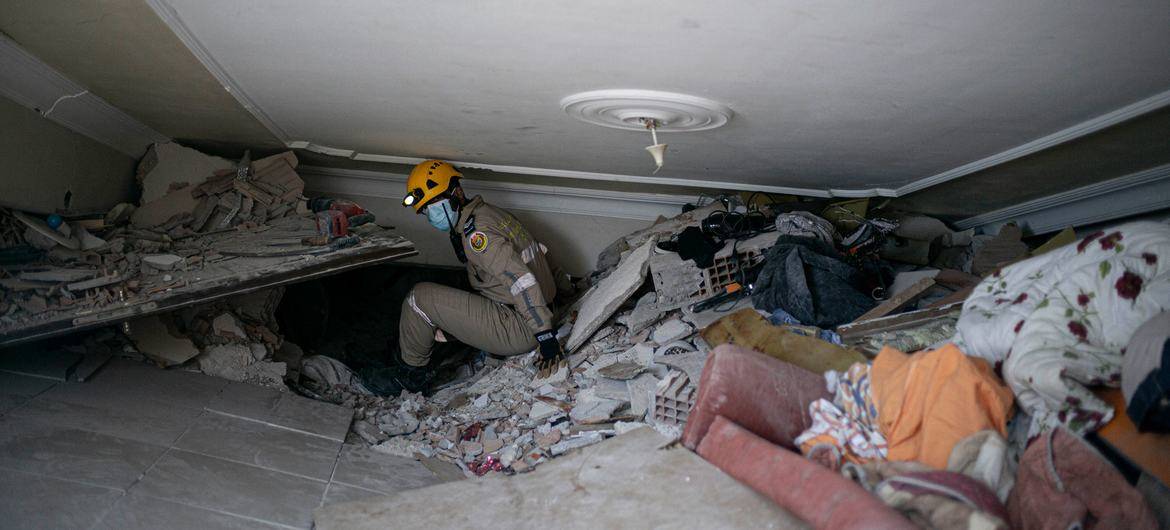 Membro da equipe de busca e resgate procura por sobreviventes logo após o terremoto de fevereiro na área turca de Atakya [Barbaros Kayan/Ocha]