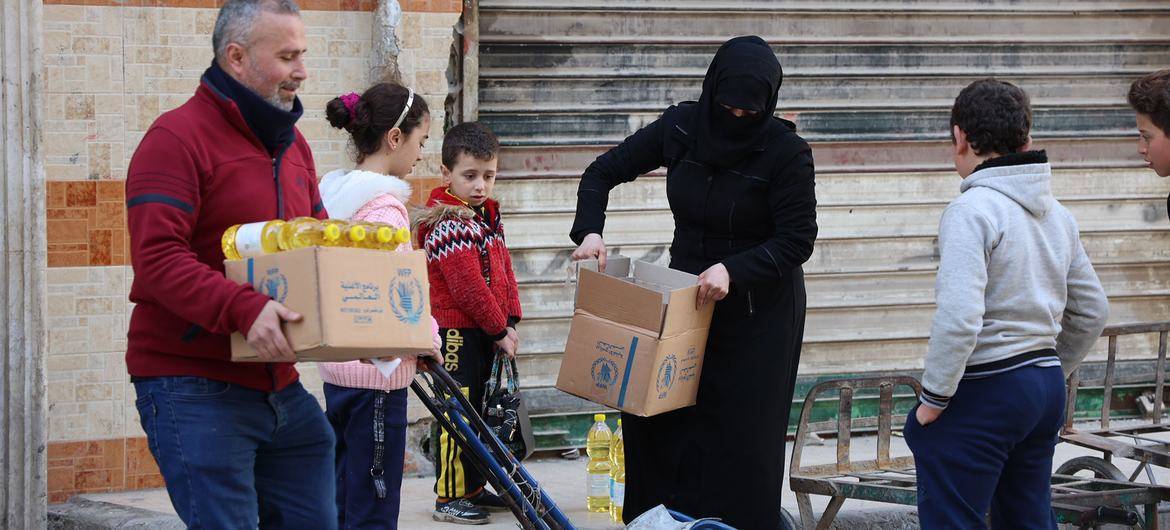 Alimentos para uso num mês são distribuídos para famílias deslocadas na área de Sukari, em Alepo, na Síria [Hussam Al Saleh/PMA]