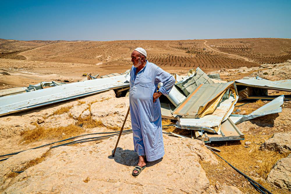Mahmud, um residente da região de Al- Markez, olha os destroços de sua casa, que foi demolida várias vezes durante os últimos anos. Masafer Yatta, Territórios Palestinos Ocupados, agosto de 2022. [Juan Carlos Tomasi/MSF]