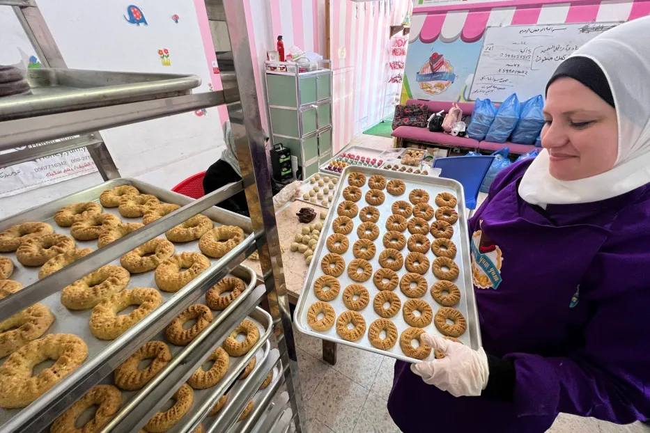 Mulheres palestinas de Gaza preparam biscoitos tradicionais de tâmaras (kaek) para o Eid al-Fitr; contudo, com um toque moderno: mergulhados em chocolate ou em cores vibrantes primaveris [Mohammed Asad/MEMO]