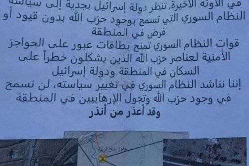 Aviões da ocupação israelense espalharam panfletos no território sírio para advertir o regime contra a presença do Hezbollah no país“Israel deu uma boa olhada na política do regime sírio que permite que o Hezbollah exista sem restrições na região”, apregoou o alerta. “Forças do regime dão salvo conduto a elementos do Hezbollah que impõem ameaça a Israel”.