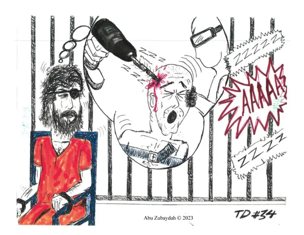 Abu Zubaydah, ex-prisioneiro, desenha as torturas aplicadas pelos Estados Unidos em Guantánamo [Abu Zubaydah/Reprodução]