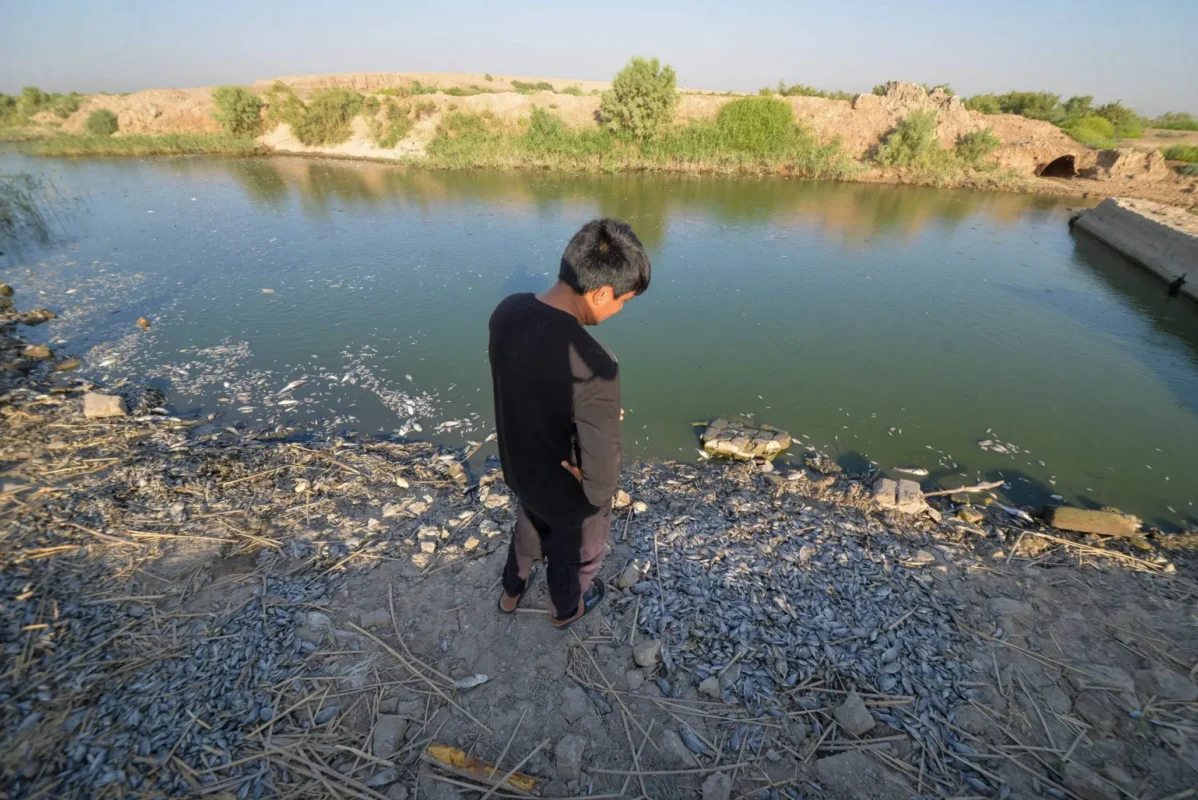 Peixes mortos no lago Micer, na província de Maysan, em Amarah, Iraque, em 5 de julho de 2023 [Haidar Mohammed Ali/Agência Anadolu]