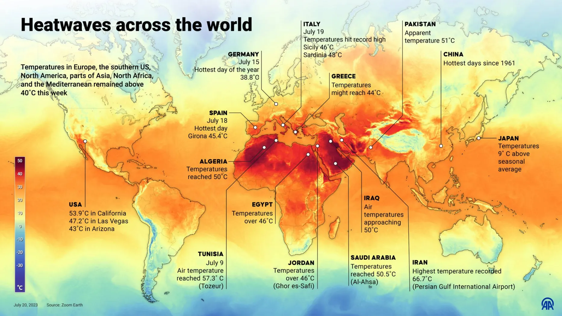 Infográfico intitulado “Ondas de calor em todo o mundo” criado em Ancara, Turquia, em 20 de julho de 2023. As temperaturas na Europa, sul dos EUA, América do Norte, partes da Ásia, norte da África e Mediterrâneo permaneceram acima de 40˚C esta semana [Elmurod Usubaliev/Agência Anadolu]