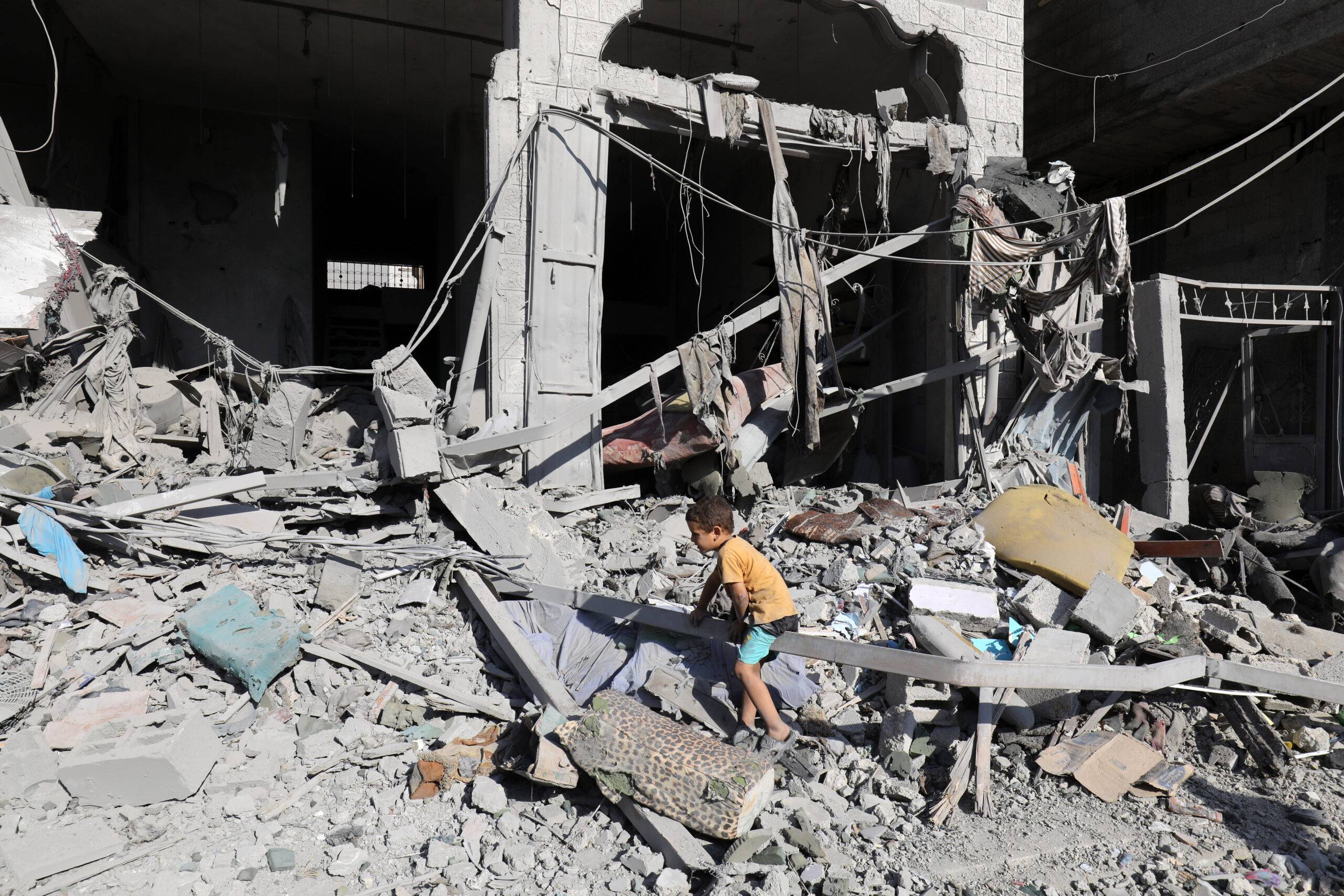Crianca em meio a edifícios destruídos após ataques aéreos israelenses em Rafah, Gaza, em 12 de outubro de 2023. [Abed Rahim Khatib/ Anadolu]