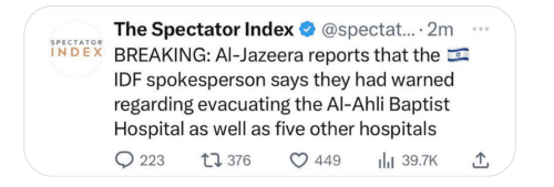 Ao verificarmos as redes sociais logo após o ataque, alguns fatos são nítidos. Se Israel não bombardeou o Hospital Baptista em Gaza, por que seu exército alertou o mesmo hospital para evacuar suas premissas pouco antes do incidente?