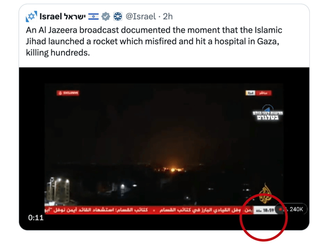 Israel insiste em não ter atacado o hospital, ao culpar um foguete do grupo de resistência Jihad Islâmica. Para “provar” sua versão, apologistas da ocupação recorreram a um vídeo transmitido cerca de uma hora antes do ataque, às 18h59 do horário local — enquanto o bombardeio de fato ocorreu em torno das 19h50.