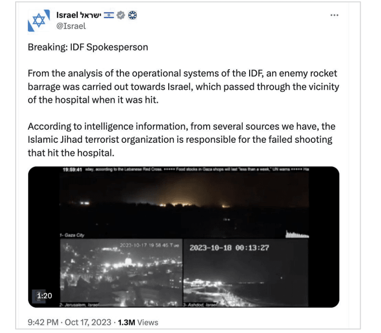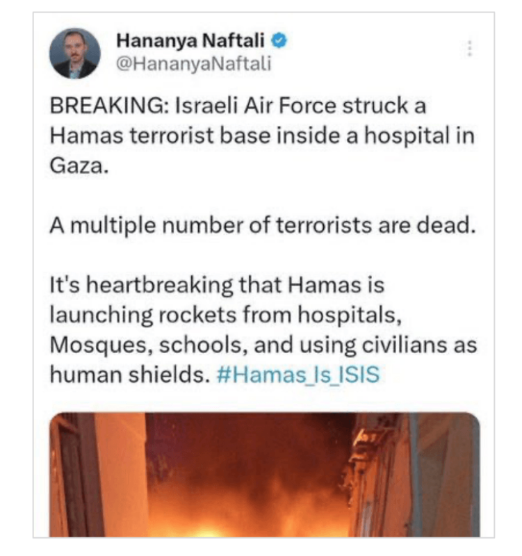 O recém-nomeado porta-voz de Comunicação Digital do regime israelense, Hananya Naftali, chegou a admitir a responsabilidade das tropas ocupantes pela chacina ao Hospital Baptista al-Ahli. Sua postagem foi deletada pouco depois.