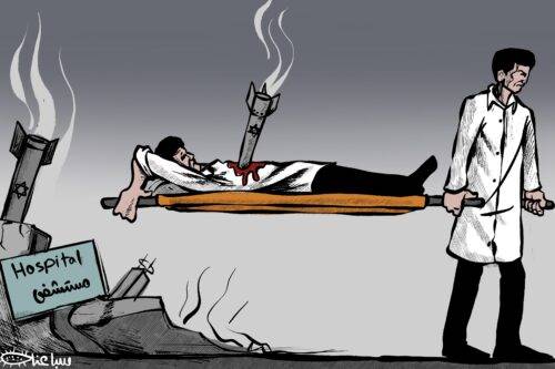 Centenas de mortos em ataque israelense ao Hospital Batista Al-Ahli, em Gaza – Charge [Sabaaneh/Monitor do Oriente Médio]EIA:Alguns palestinos, seduzidos pelas esmolas americanas ou abalados por um sentimento persistente de derrota, fizeram fila para receber os dividendos da paz EUA-Israel: migalhas lamentáveis de falso prestígio, títulos vazios e poder limitado, concedidos e negados pelo próprio Israel.