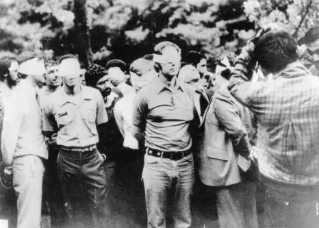 Foto tirada no primeiro dia de ocupação da Embaixada dos EUA em Teerã mostra reféns americanos desfilando por seus captores militantes iranianos, em 4 de novembro de 1979 [Bettmann/Getty Images]