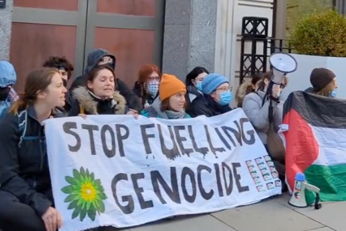 Em vídeo divulgado na rede social X (Twitter), declarou o grupo: “Israel recentemente deu à BP permissão para explorar gás natural na costa de Gaza. Israel comete genocídio, mas a BP vê isso como oportunidade de negócio. Não haverá justiça climática sem justiça para o povo palestino!”