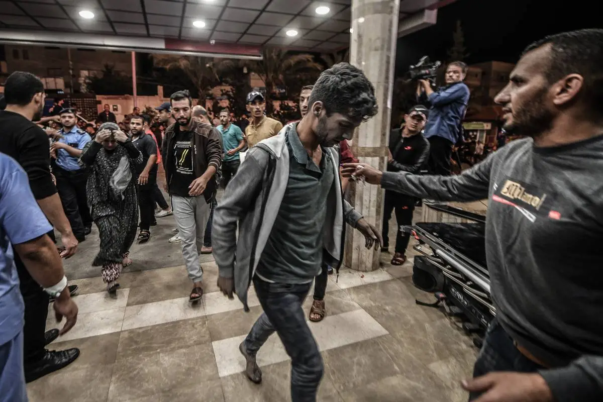Feridos em decorrência de ataques aéreos israelenses são levados para o Hospital Nasser para tratamento, já que os ataques de Israel à Faixa de Gaza continuam no oitavo dia em Khan Yunis, Gaza, em 14 de outubro de 2023. [Abed Zagout/Agência Anadolu].