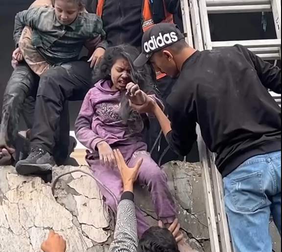 Residentes e equipes da defesa civil resgatam uma mãe e seus filhos dos escombros