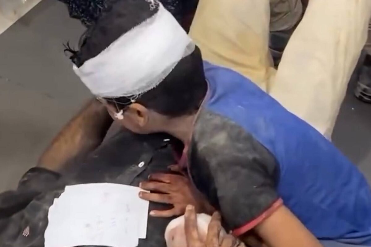 Menino abraça seu pai, ferido por um ataque aéreo israelense, em Gaza.