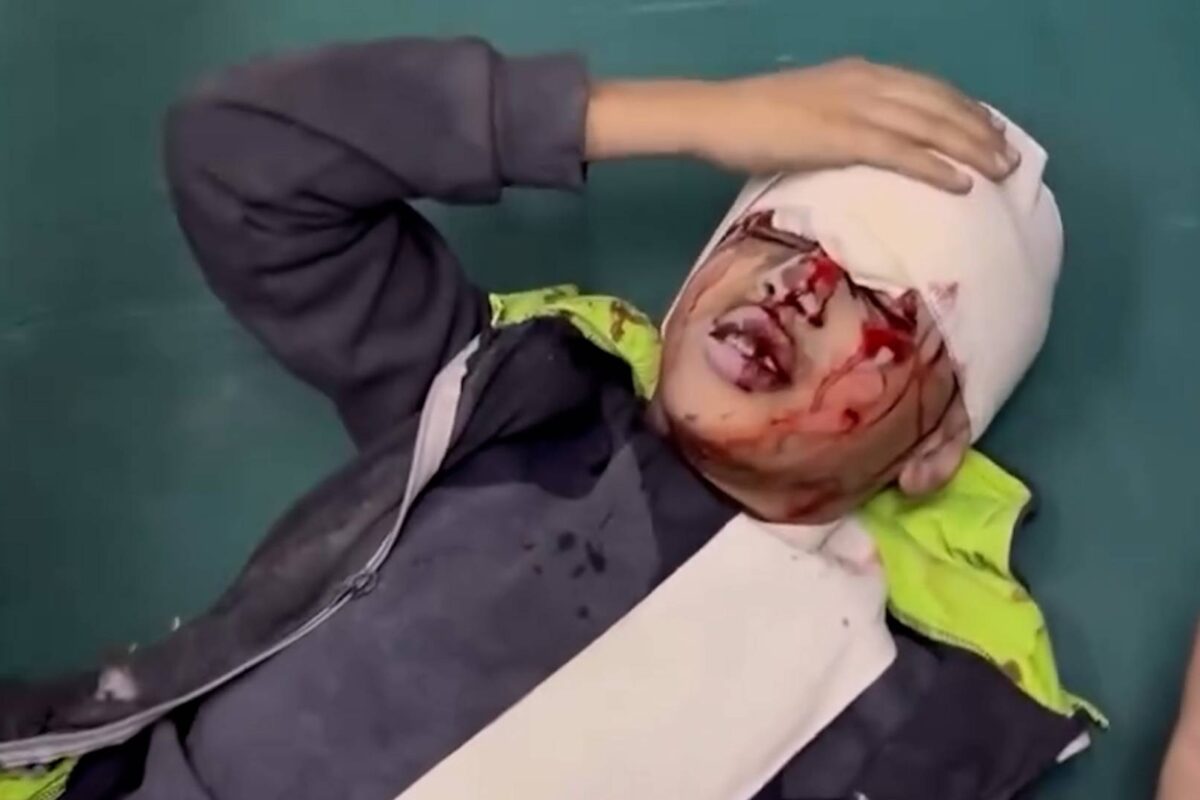 Menino recebe tratamento médico após ser ferido por um ataque aéreo israelense contra sua casa, em Rafah, no sul de Gaza, em 9 de janeiro de 2024. Via @shehab._2001