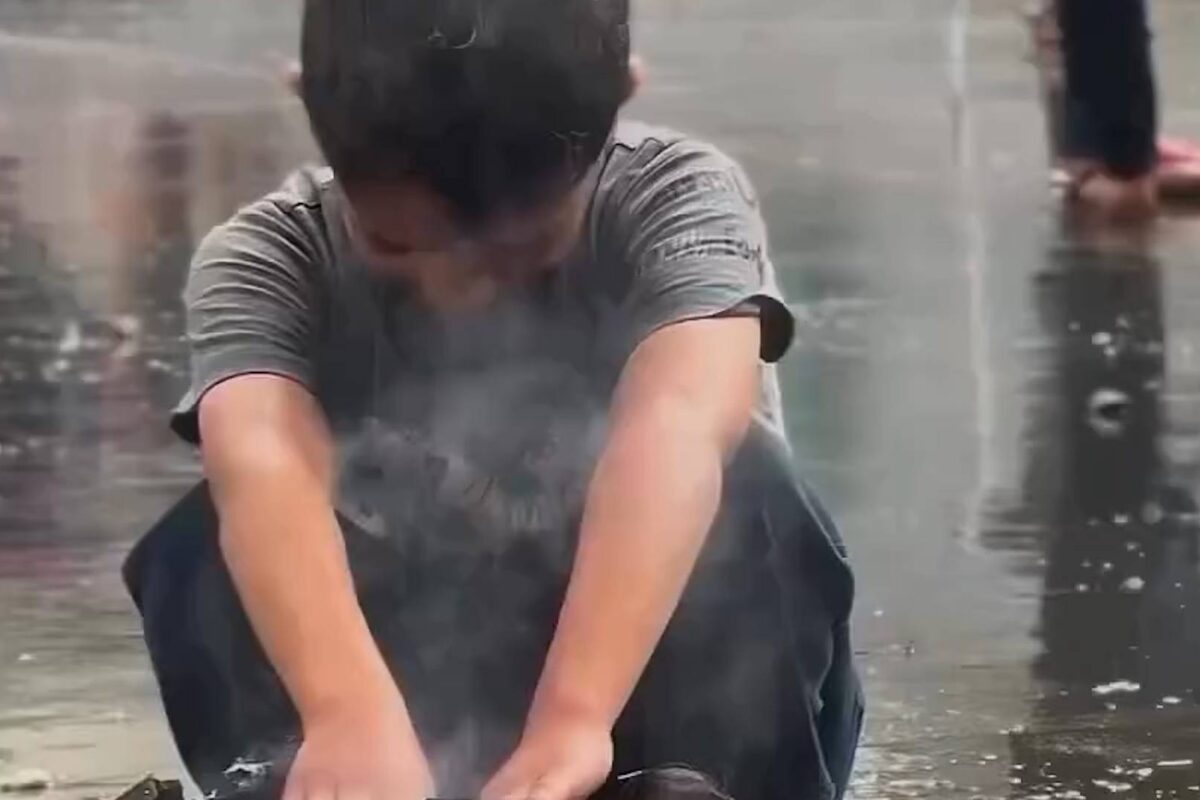 Criança tenta se aquecer sob as chuvas de inverno em Gaza