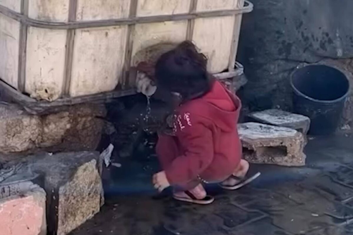 Menina palestina tenta matar a sede de uma caixa d’água, em um dos abrigos aos deslocados de Gaza