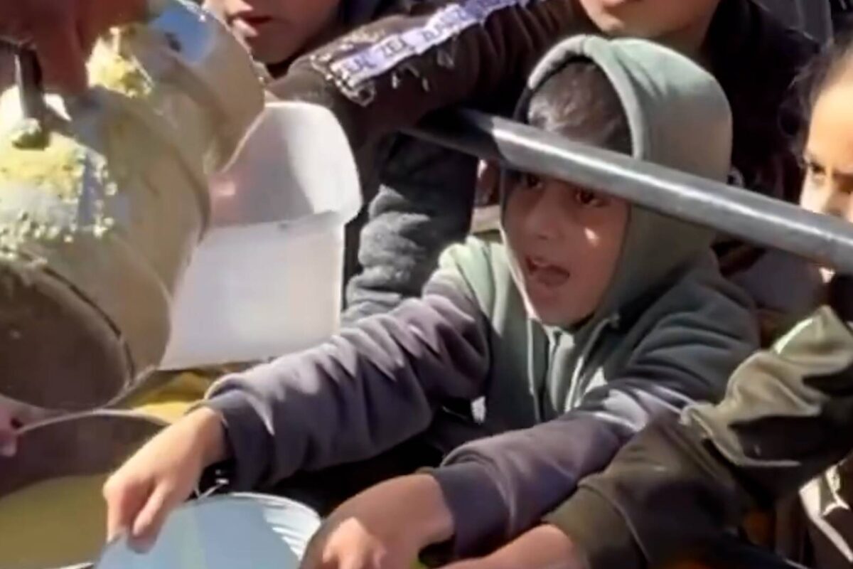 Crianças palestinas deslocadas pelos bombardeios de Israel tentam obter alimento distribuído por organizações humanitárias em Rafah