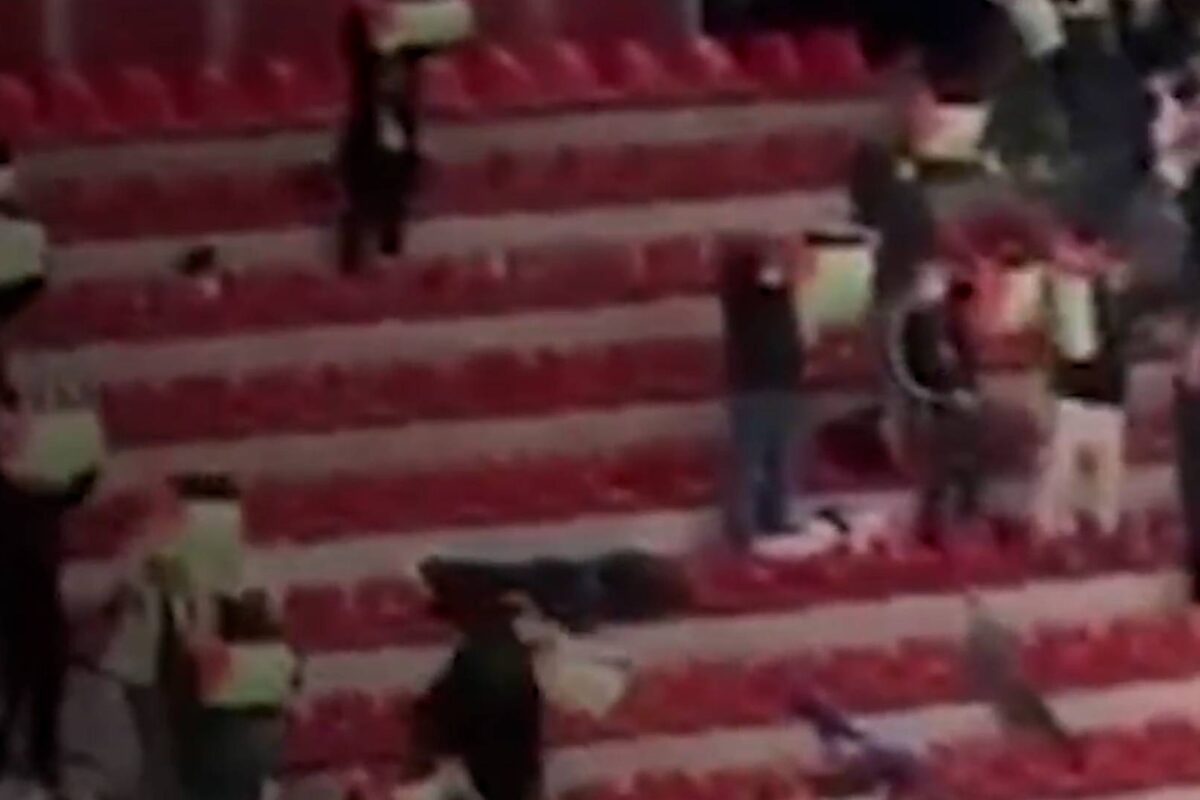 Torcedores bascos erguem bandeira palestina durante partida contra o Maccabi Tel Aviv