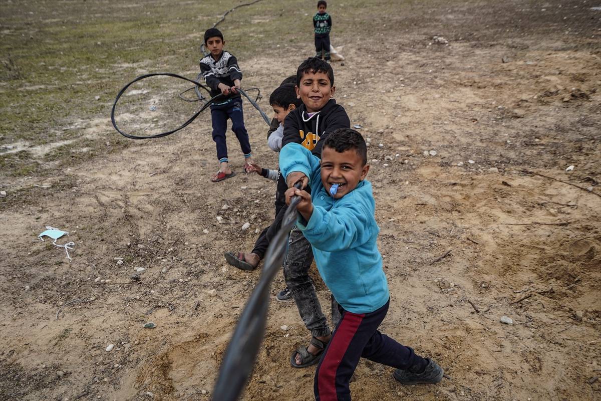 Em meio ao apagão elétrico e a falta de comida, crianças palestinas brincam com fios de eletricidade tentando driblar as péssimas condições em que vivem nos campos de refugiados na fronteira entre Egito e Gaza na cidade de Rafa, enquanto ataques israelenses continuam, em 05 de fevereiro de 2024. [Belal Khaled]