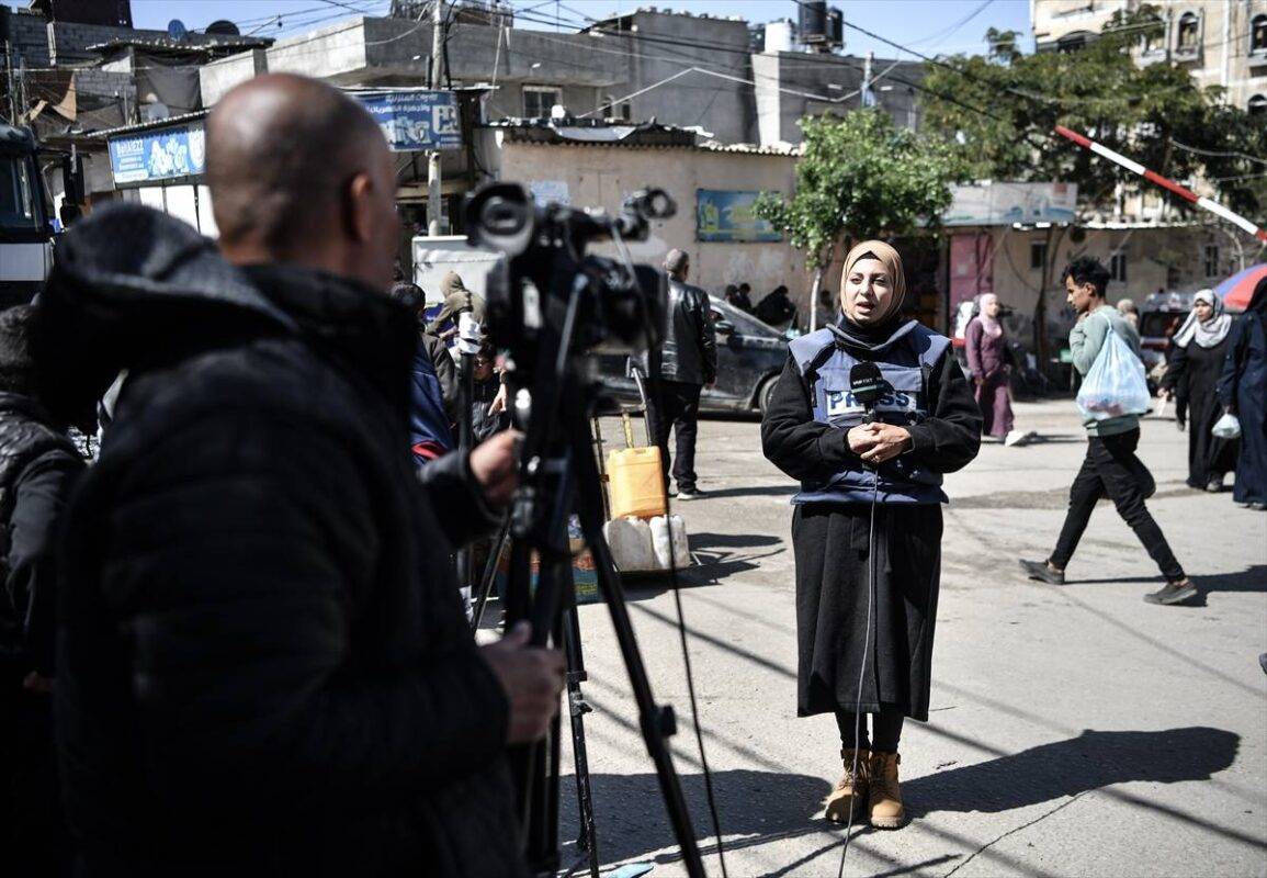 Apesar da dificuldade do trabalho em Gaza e dos riscos iminentes causados pelos ataques do exército israelense, as jornalistas palestinas continuam a deslocar-se de um lugar para outro para documentar e mostrar ao mundo a tragédia que vive o povo palestino no meio de bombardeamentos contínuos e bloqueio israelense. [Abed Zagout/Agência Anadolu]