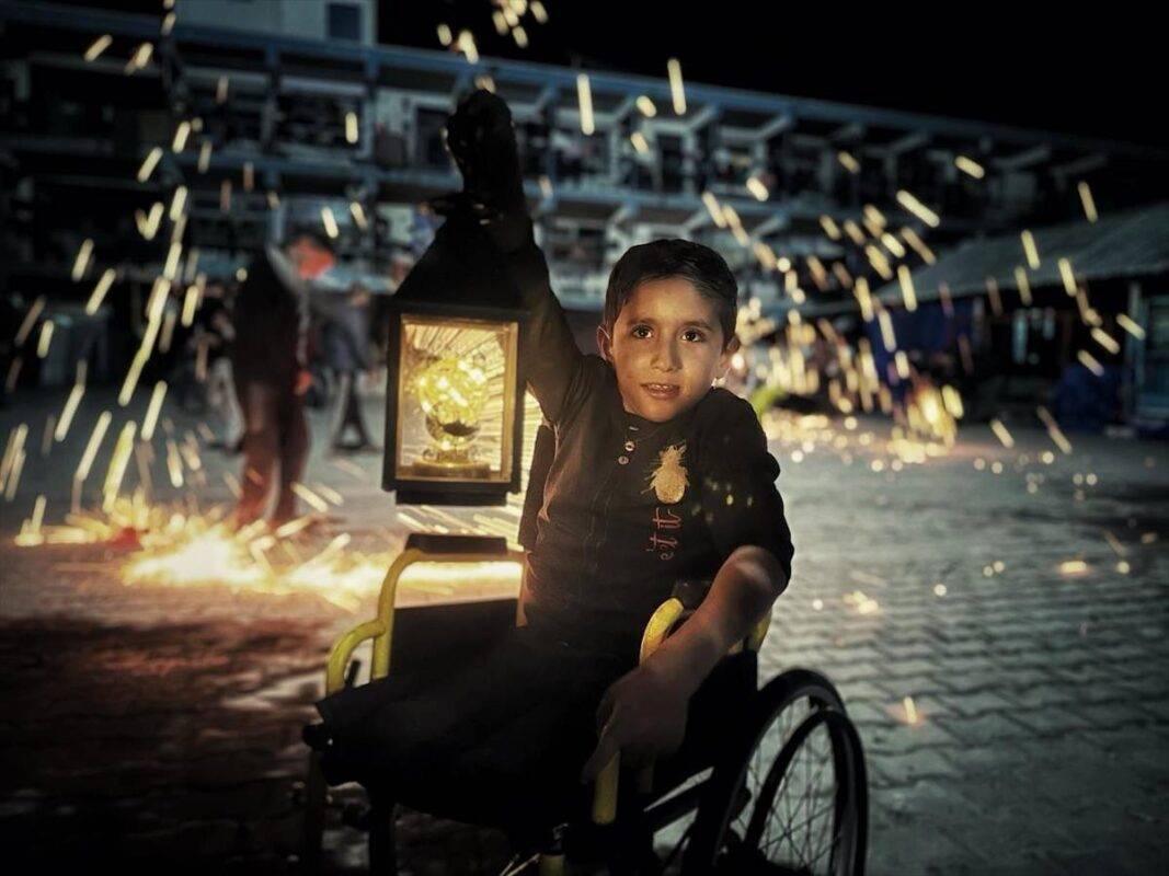 Crianças palestinas, que se refugiam em uma escola para se protegerem dos ataques israelenses, passam algum tempo girando faíscas depois de terem o primeiro jantar de jejum (iftar) no primeiro dia deRamadã na Cidade de Gaza, Gaza, em 11 de março de 2024.[Abdullah Obead/Agência Anadolu]