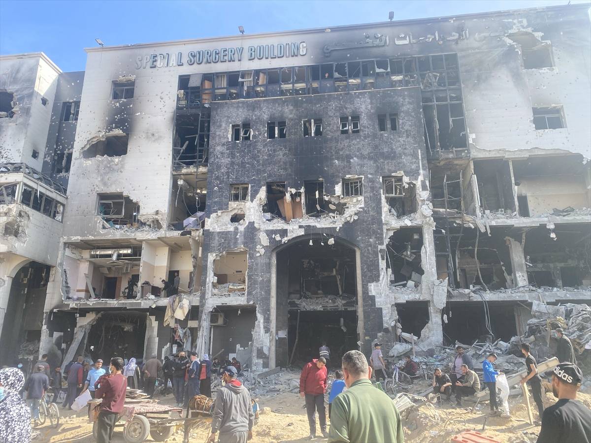 Imagens de destruição do hospital Al-Shifa e dos edifícios vizinhos. Israel cercou o complexo hospitalar por 14 dias que resultou em dezenas de vítimas e centenas de prisões. [Osama Rabi e Ramzi Mahmud/Agência Anadolu]