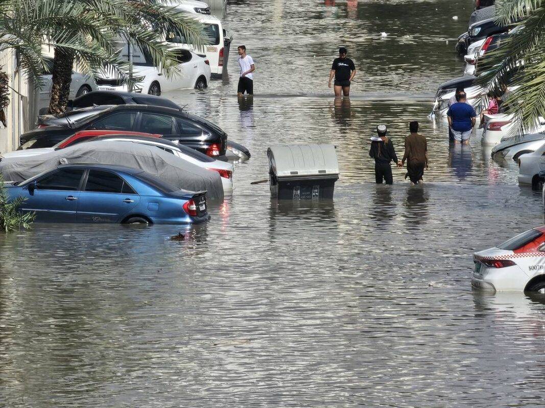 Os Emirados Árabes Unidos registraram chuvas recordes com 254 mm caindo em menos de 24 horas em Al Ain, cidade na fronteira entre os Emirados Árabes Unidos e Omã. De acordo com o centro meteorológico nacional esse foi o maior número desde que os registros começaram em 1949, antes da criação dos Emirados Árabes Unidos em 1971. [Nur Seray Sik/Agência Anadolu]
