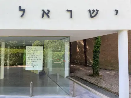 O que encontramos colado nas paredes de vidro do Pavilhão de Israel no Giardini foi um cartaz dizendo que o artista e os curadores do pavilhão não abrirão até que “um acordo de cessar-fogo e libertação de reféns seja alcançado”.