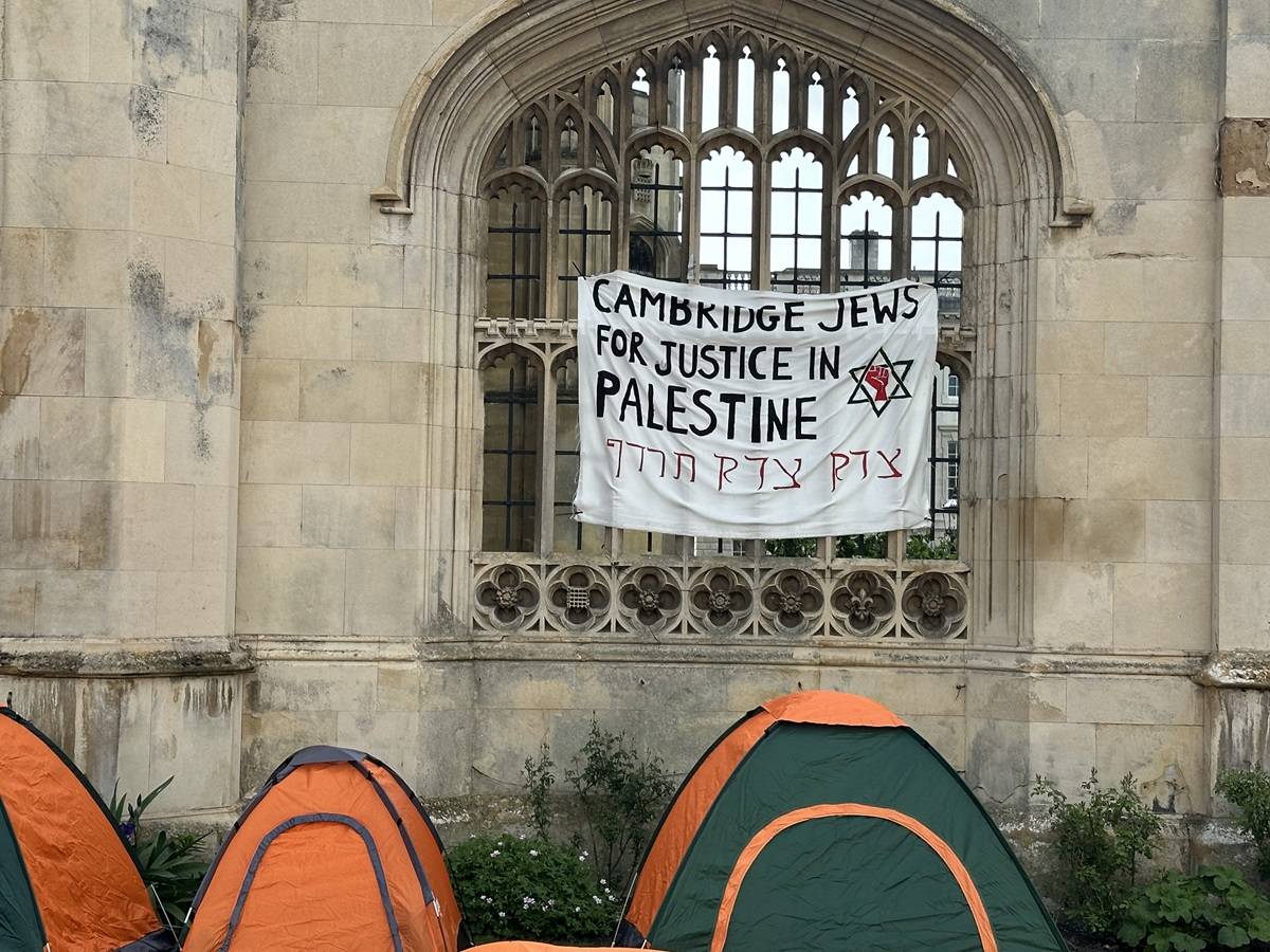 Acampamento de solidariedade a Gaza na Universidade de Cambridge, na Inglaterra, em 7 de maio de 2024. Na faixa: “Judeus de Cambridge por justiça na Palestina” [Aysu Biçer/Agência Anadolu]