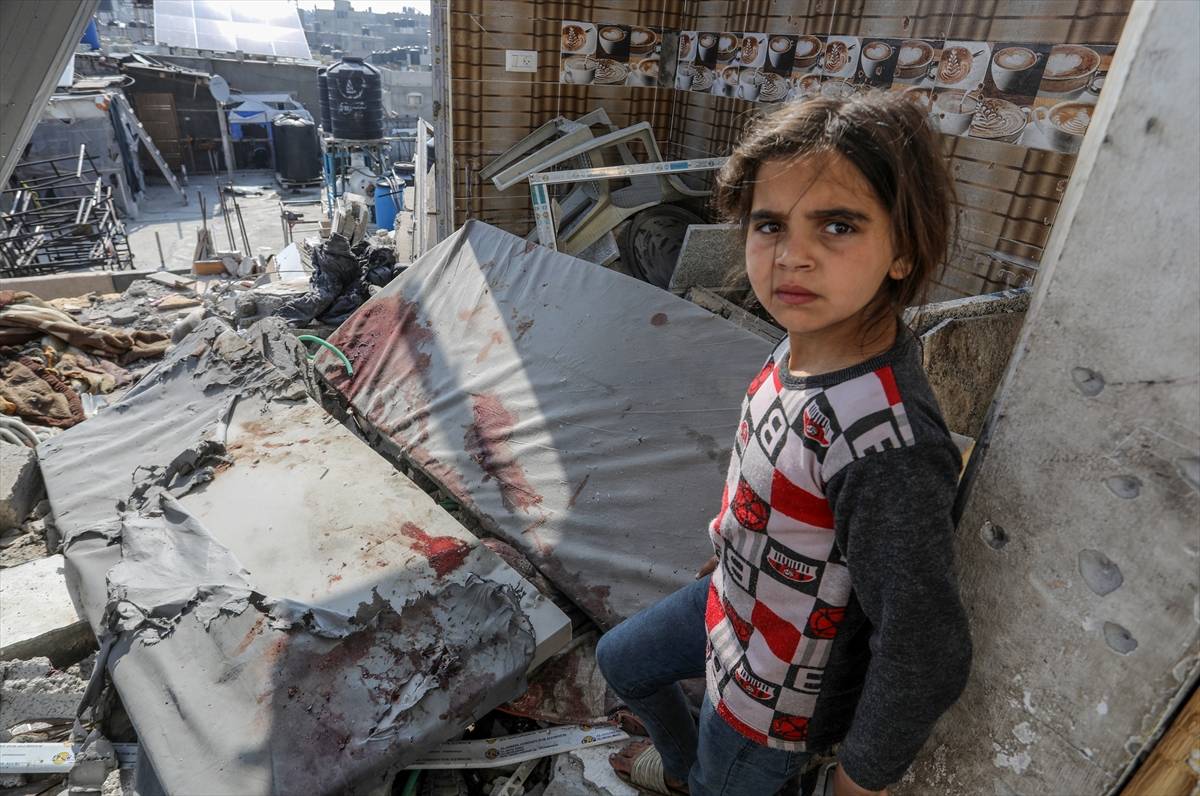 Palestinos se reúnem para inspecionar o prédio que desabou após bombardeio israelense atingir a casa pertencente a uma família deslocada em Rafah, Muitos edifícios foram destruídos ou fortemente danificados no ataque em 16/04/2024 [Abed Rahim Khatib/Agência Anadolu]
