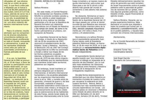 A mobilização social existe e é isso que aproxima o Panamá da luta palestina. Uma carta do Comitê Panamenho de Solidariedade à Palestina (Copasolpa) pediu à atual chanceler, em fim de governo, que abra relações com a Palestina e rompa laços com Israel. A organização agradeceu pelo fato de que, pelo menos, no dia 10 de maio, a diplomata não tenha se colocado contra a nova resolução que amplia direitos palestinos na ONU.