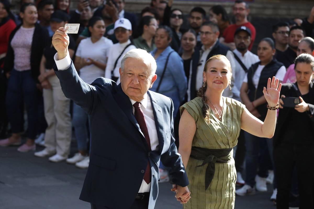 Presidente do México, Andrés Manuel López Obrador, deixa sessão de votação junto da primeira-dama, Beatriz Gutierrez Muller, no Museu de Arte do Ministério das Finanças, na Cidade do México, em 2 de junho de 2024 [Daniel Cardenas/Agência Anadolu]