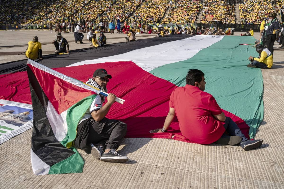 Ativista estendem enorme bandeira palestina durante comício do Congresso Nacional Africano (CNA) no Estádio Cidade do Futebol, em Joanesburgo, na África do Sul, em 29 de maio de 2024 [Ihsaan Haffejee/Agência Anadolu]
