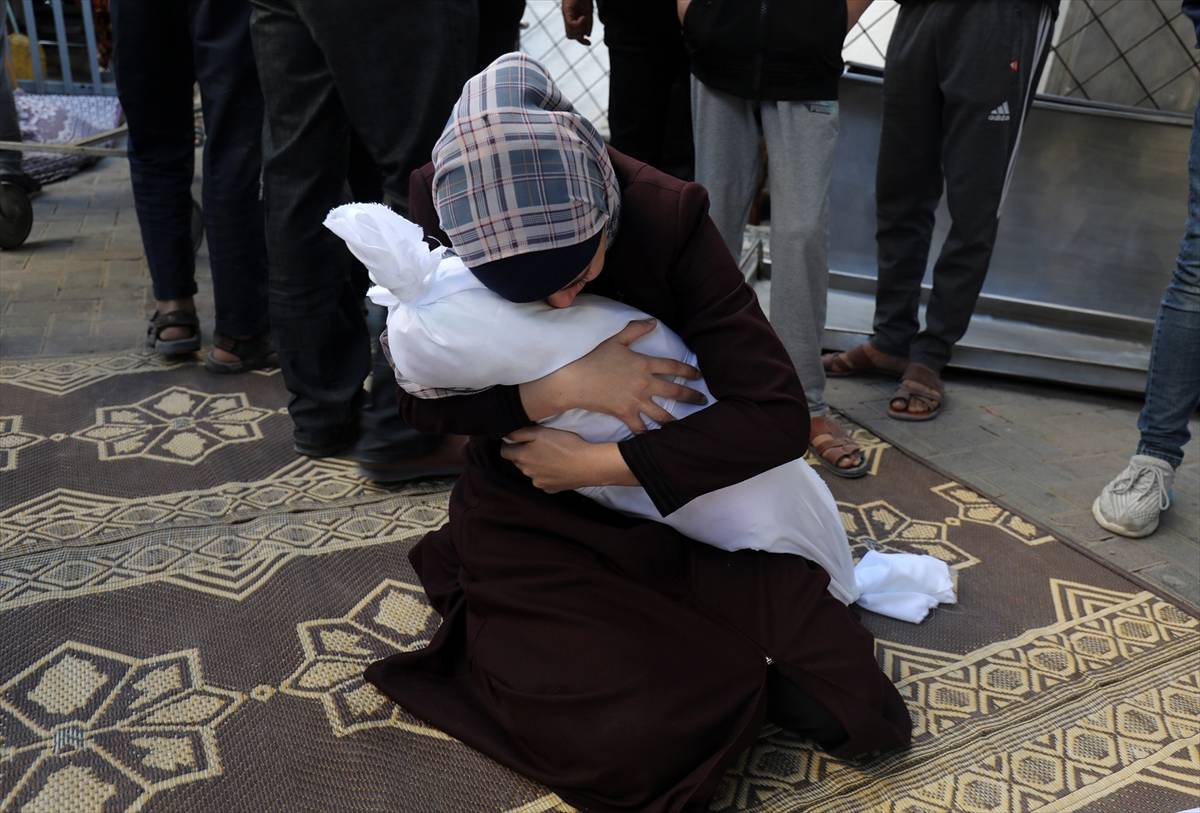 Uma mãe palestina abraça o seu filho que foi morto pelos bombardeios israelenses em Rafah, Gaza, em 21 de outubro de 2023.