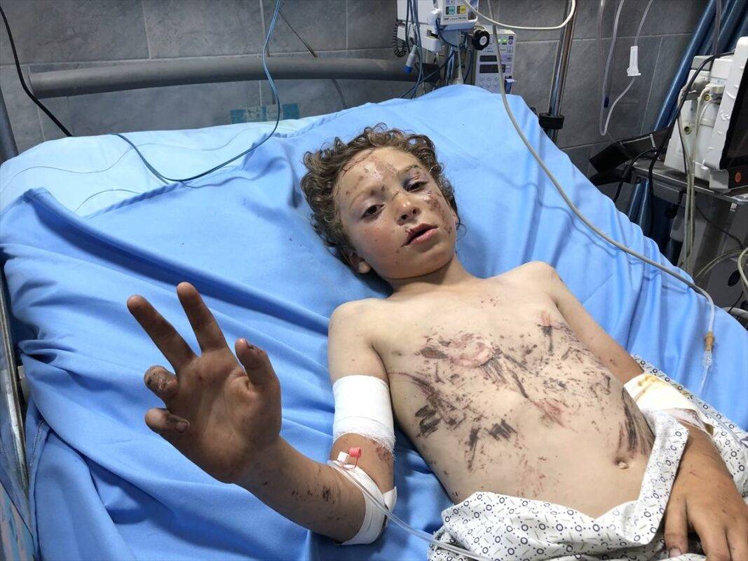 Os irmãos Muhanna, que foram retirados dos escombros da casa que desabou em consequência do ataque, sofreram ferimentos graves e queimaduras no corpo. [Khalit Alkahlut/Agência Anadolu]
