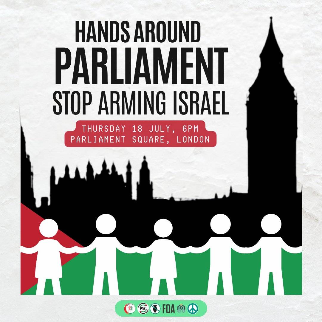 A convocatória circula nas redes sociais e fontes estimam que mais de 7.000 pessoas participarão do abraço ao parlamento britânico previsto para hoje ainda, formando uma corrente humana em torno do Parlamento britânico, de acordo com a Palestine Solidarity Campaign.