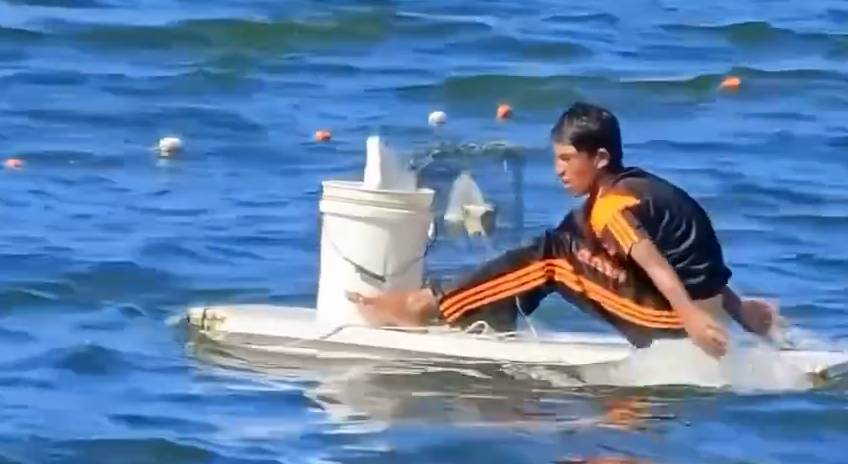 Uma criança usa uma porta como barco para pegar peixes para sua família em Gaza.
