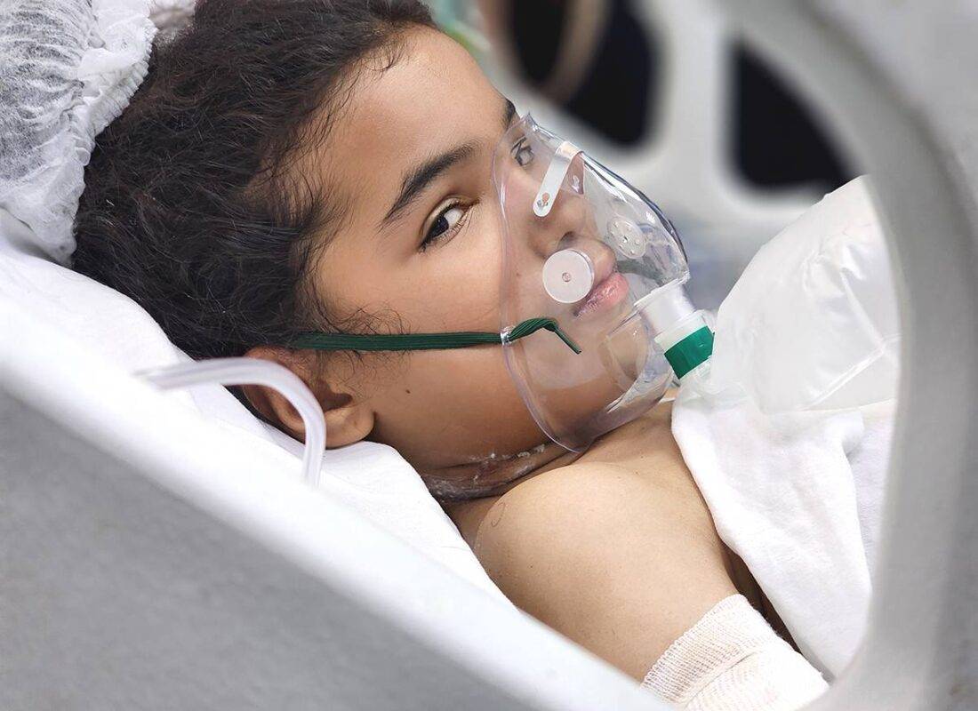 A menina palestina de 14 anos, Razan Arafat Barbah, teve suas duas pernas amputadas devido a um ataque israelense à sua casa na cidade de Rafah, no sul de Gaza. Barbah está sendo tratada em instalações limitadas no Hospital Nasser em Khan Yunis, além da dor da aputação, a menina luta contra a talassemia. [Hani Alshaer/Agência Anadolu]