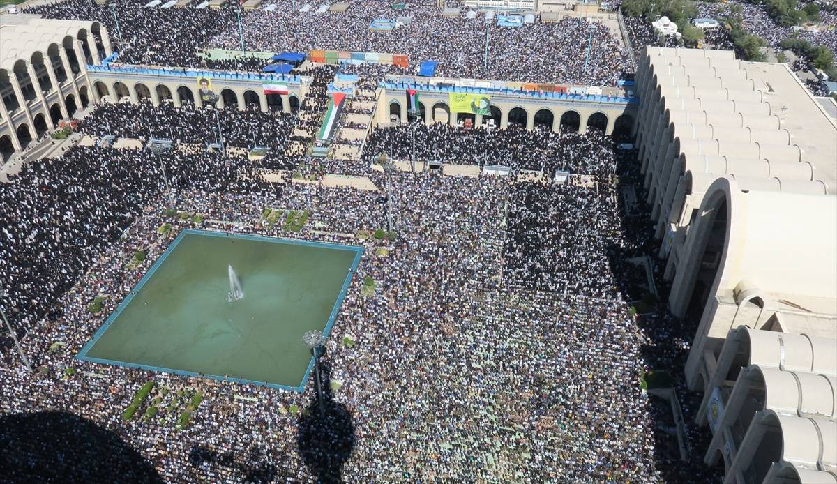Nas ruas, milhares de iranianos manifestaram apoio, alguns com bandeiras palestinas — muitos com bandeiras verde-amarelas do Hezbollah libanês. No púlpito, foi instalado um retrato de Khamenei ao lado de uma fotografia de Nasrallah.